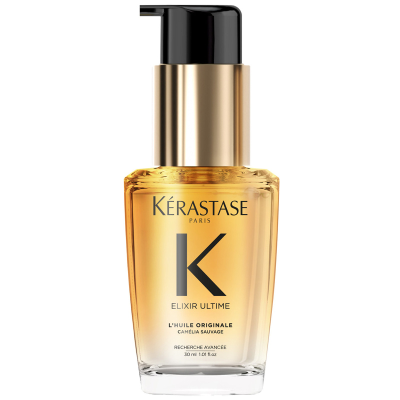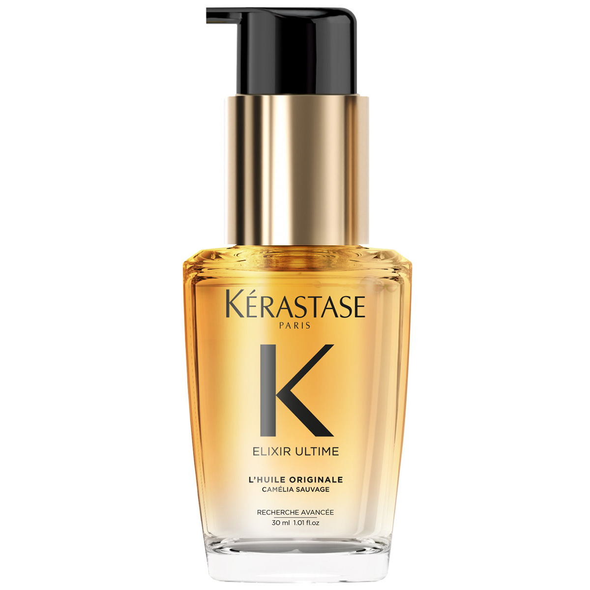 De iconische Elixir Ultime Oil, verjongd. Dit 30ml formaat haarolie is perfect voor glanzend haar onderweg!