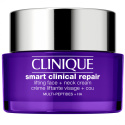 Clinique Smart Clinical Repair Lifting Face + Neck Cream is een luxe anti-aging crème voor het gezicht en de hals, waarvan klinisch is bewezen dat het de zichtbaarheid van rimpels en fijne lijntjes vermindert, de huid zichtbaar strakker maakt en de gerimpelde huid in de hals gladder maakt. Deze crème is verrijkt met multi-peptiden die de huid verstevigen en de natuurlijke collageenproductie ondersteunen, waardoor de huid er steviger uitziet en rimpels en fijne lijntjes minder zichtbaar worden. Ondertussen zorgen hyaluronzuur, jojoba-olie en sheaboter voor onmiddellijke en langdurige hydratatie, meer volheid, meer soepelheid en vervagen fijne droogtelijntjes.