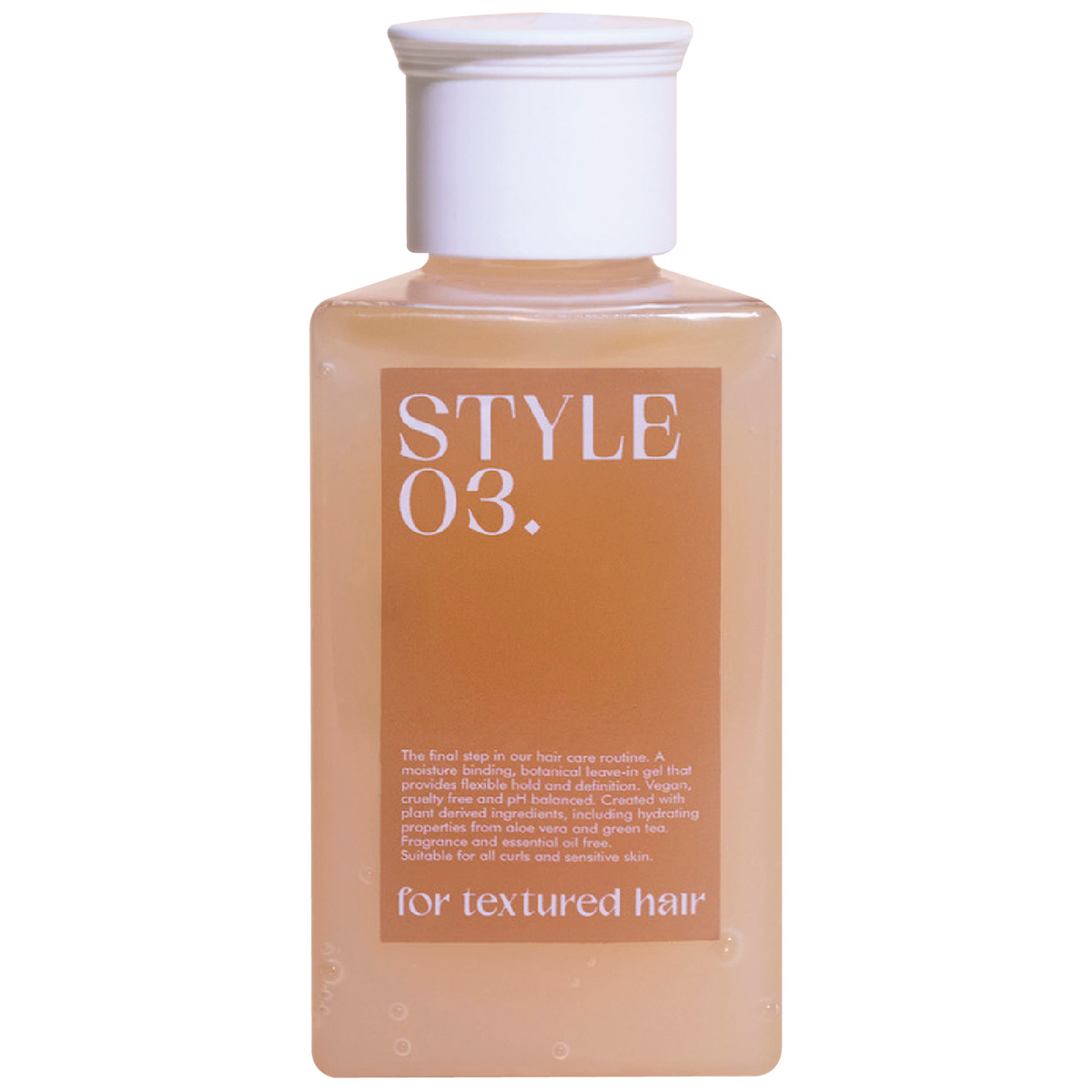 STYLE 03 is de derde en laatste stap in de WASH 01, HYDRATE 02, STYLE 03 haarverzorgingsroutine voor getextureerd haar. Het is een geurvrije en vochtbindende botanische gel die zorgt voor flexibele fixatie en hydraterende definitie. Gemaakt zonder agressieve chemicaliën en ontwikkeld volgens de cosmetische regelgeving van de EU. Geschikt voor de gevoelige huid. Speciaal ontworpen en gecreëerd voor de verzorging van getextureerd haar.