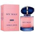 My Way Intense is een uitnodiging voor een innerlijke reis, betekenisvolle ontmoetingen en verbeterde ervaringen. Een bloemige geur met verslavende houtnoten en duurzaam geteelde ingrediënten. De geur opent met zuivere geurnoten van oranjebloesem uit Egypte. Een intense hartnoot waarin tuberoos uit India een romig en fluweelachtig facet van de bloemige signatuurgeur onthult. De basisnoot van sandelhout uit Nieuw-Caledonië zorgt voor een zachte en romige twist wanneer het sensueel rijke vanille uit Madagaskar ontmoet. De blauw en goud glinsterende kurk symboliseert een talisman die elke ervaring vastlegt. De intensiteit van deze momenten wordt weerspiegeld in de My Way Intense fles, die nu een glas heeft dat glinstert in doorschijnende blauwe reflecties. Deze luxueuze geur is navulbaar en bevat verantwoord en duurzaam geteelde ingrediënten. Een talisman die elke kostbare ontmoeting samenvat Geur familie: Bloemige geurenProductlijn: Giorgio Armani My Way