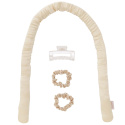 Creëer prachtige krullen zonder warmte HeatlessWaves is ontworpen om prachtige krullen te creëren zonder hitte en is gemaakt van moerbeizijde. Een krultang beschadigt, verbrandt en verslijt je haar. HeatlessWaves geeft je mooie ronde gladde krullen terwijl je fijne haar behouden blijft. Wat is het verschil tussen HeatlessWaves en een krultang? HeatlessWaves is volledig hittevrij en kan het beste gebruikt worden op nat haar. Het beschadigt je haar niet en geeft je prachtige krullen zonder je haar te verbranden of te scheuren. Een krultang wordt gebruikt met hoge hitte en op droog haar. Dit zijn twee verschillende producten die vergelijkbare resultaten geven. * Stof: 100% Zijde, 22-Momme * Kleur: Goudkleurig zand * Afmetingen: 95 cm lang, 3 cm in diameter * Meegeleverde accessoires: 1 haarclip en 2 satijnen scrunchies. * Productie heeft plaatsgevonden onder geautoriseerde omstandighede