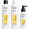 Nioxin System 1 Trial Kit is een haarverzorgingssysteem voor natuurlijk haar met lichte uitdunning. Deze unieke set van drie professionele haarverzorgingsproducten is speciaal ontworpen als een haarverdikkingsbehandeling die de hoofdhuid verfrist en zorgt voor voller uitziend haar. De Nioxin System 1 routine verfrist de hoofdhuid, vermindert haaruitval door breuk, versterkt het haar en zorgt voor een gezonde glans. Nioxin Cleanser Shampoo verwijdert vuil, talg en andere omgevingsresten van de hoofdhuid en het haar. Nioxin Scalp Therapy Conditioner is een lichtgewicht conditioner die het haar veerkracht geeft en het haar van wortel tot punt hydrateert. Nioxin Scalp & Hair Treatment verfrist de hoofdhuid en helpt het haar er dikker uit te laten zien door de volheid van elke haarlok te vergroten. Van de kit is klinisch bewezen dat het haarverlies door breuk tot 91%** vermindert.
