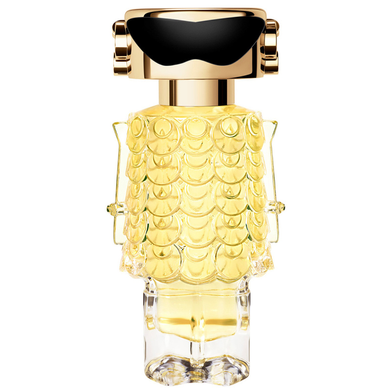 De flacon is geïnspireerd op Rabanne's legendarische modecreaties en de onvergetelijke maliënkolderjurk. FAME Parfum is als een kostbaar en sprankelend sieraad dat Rabanne's onweerstaanbare Parijse signatuur inkapselt en een nieuw vrouwelijk tijdperk viert. De gouden tint van FAME contrasteert elegant met de zwarte jurk en past bij de intensiteit van het gouden, champagnekleurige parfum dat erin zit.