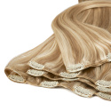 De clip-on set is een complete set haarstukken die gebruikt kan worden voor een tijdelijke haarverlenging of voor extra volume met een natuurlijk resultaat. Bevestig de verschillende delen eenvoudig met de aangenaaide clips. De zachte lok van de clip-on set volgt de vorm van het hoofd voor maximaal comfort. Het volle haar is echt en kan gemakkelijk gestyled worden met je eigen haar. Mix een 7-delige set met een 3-delige set voor maximaal volume. Productgegevens: Hoeveelheid: 7 haarstukken met clips Breedte: 1 x 20 cm (4 clips) 2 x 15 cm (3 clips) 2 x 10 cm (2 clips) 2 x 5 cm (1 clip) Gewicht 30 cm: 80 g haar. Totaal gewicht: 90 g Gewicht 40 cm: 100 g haar. Totaalgewicht: 110 g Gewicht 50 cm: 110 g haar. Totaalgewicht: 120 g Gewicht 60 cm: 120 g haar. Totaalgewicht: 130 g Gewicht 70 cm: 130 g haar. Totaalgewicht: 140 g Hoeveel verpakkingen heb ik nodig? Eén pak van 7 stuks voor een lichtgewicht haarverlenging/verdikking Eén pakje van 7 stuks en één pakje van 3 stuks voor een extra volle haarverlenging/verdikking. Twee 7-packs voor een haarverlenging/verdikking met maximaal volum