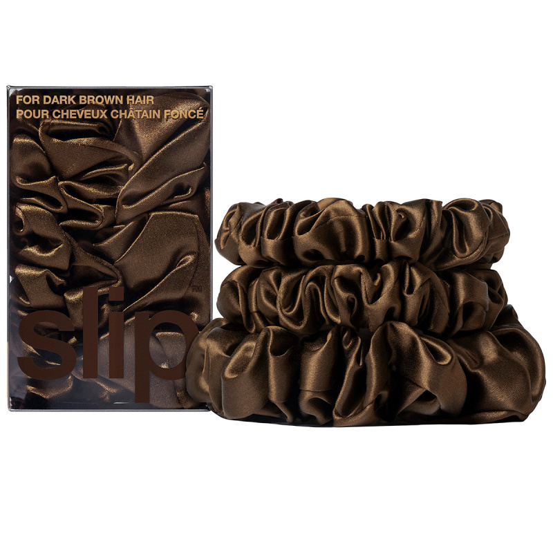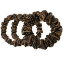 Bevat: 2 x donkerbruine medium scrunchies van pure zijde, 1 x donkerbruine grote scrunchie van pure zijde.